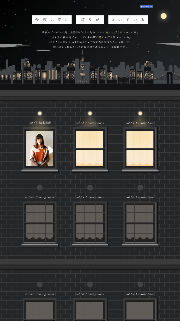 クリエイティブ専門誌「ブレーン」巻末にて「窓の灯り」をテーマに人気作家の方々にリレー形式でエッセイを執筆頂く連載企画。