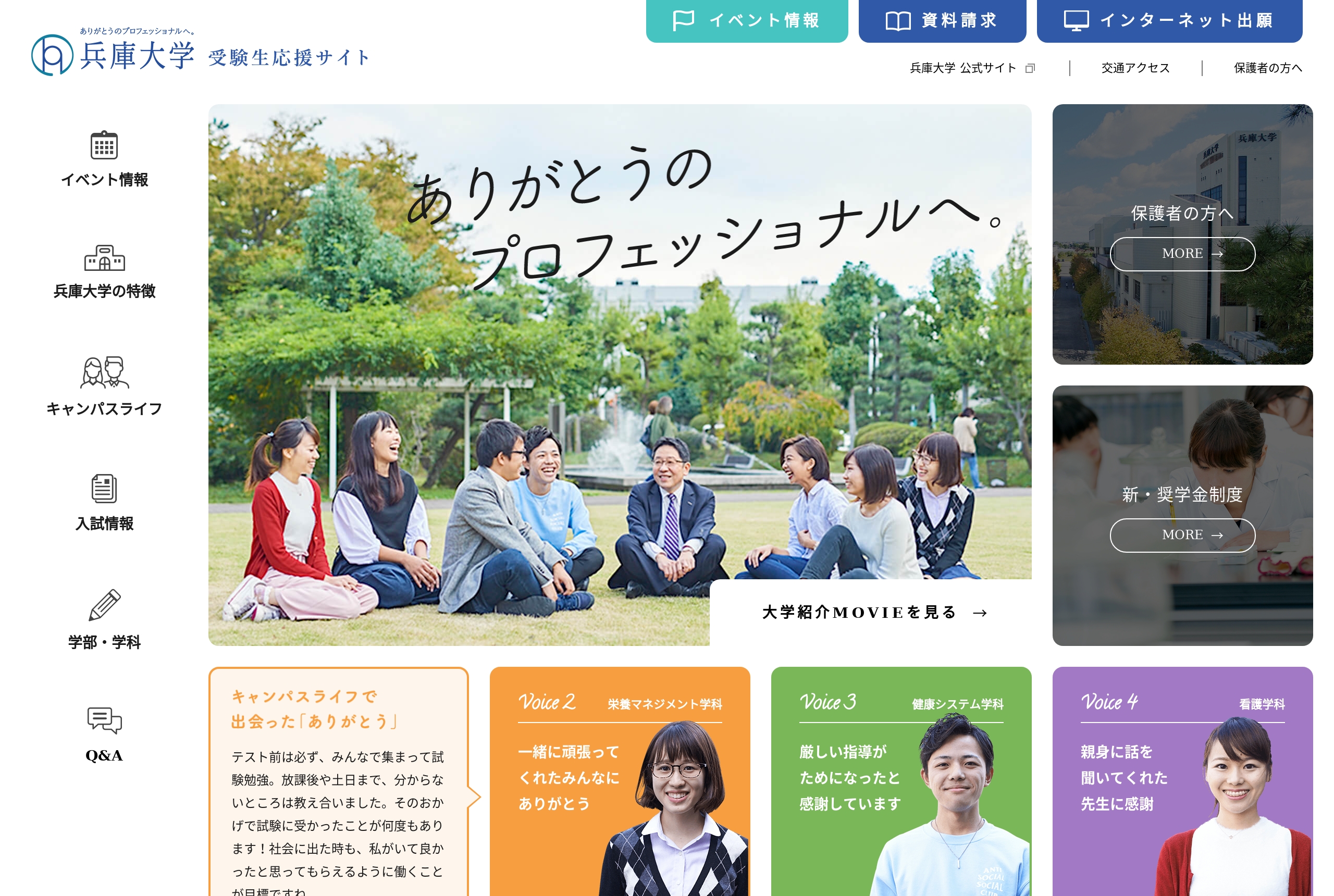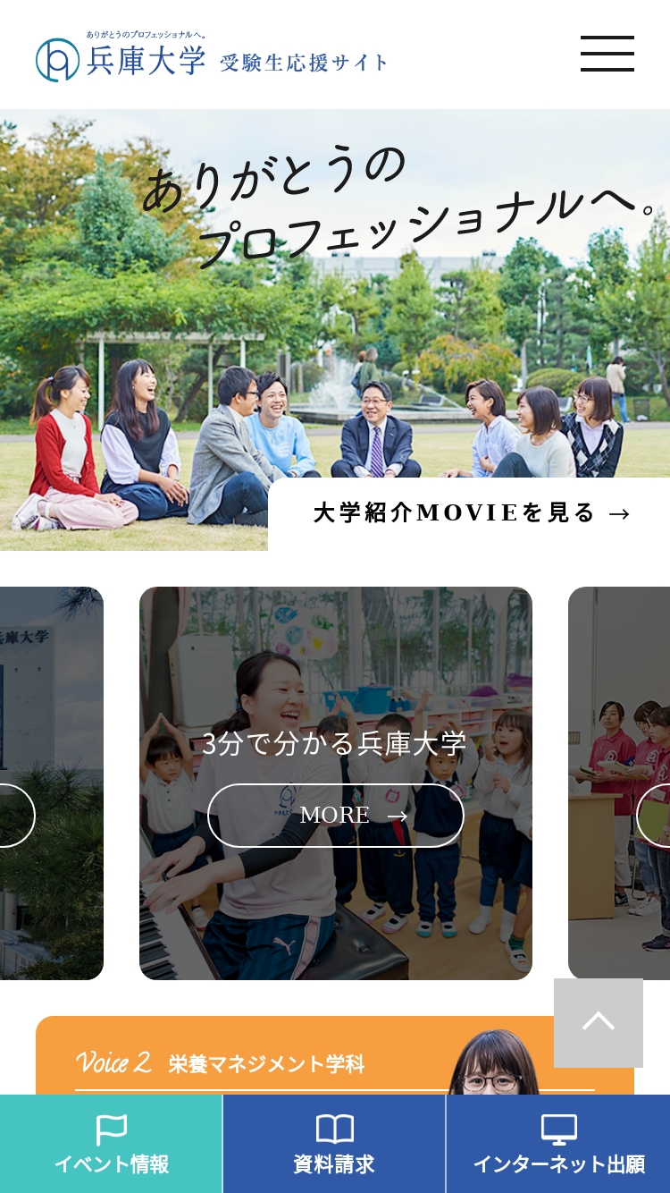 兵庫大学をめざす受験生たちを応援するウェブサイトです。サイトでは入試情報や学部学科紹介、入試直前相談会についてなど、受験生の皆さんに兵庫大学の魅力を感じてもらえる情報を掲載しています。