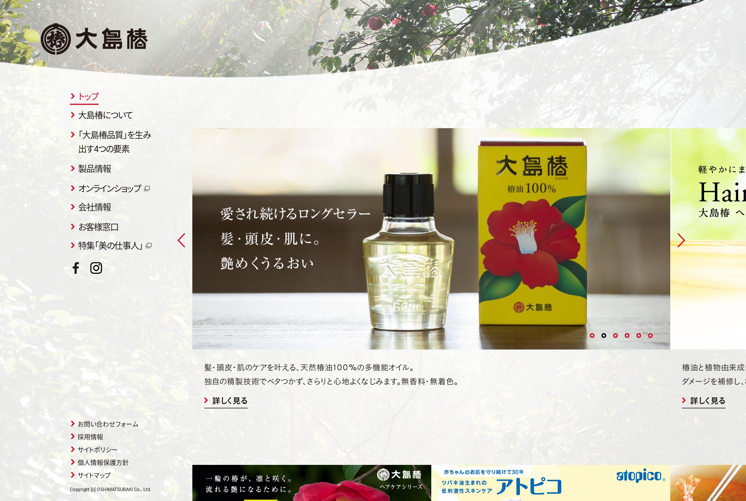 https://www.oshimatsubaki.co.jp/1927年創業の椿油専門メーカー、大島椿の公式サイト。椿油100%のロングセラーオイル「大島椿」をはじめ、椿油配合のヘアケア・スキンケア商品など、椿油にこだわった商品をお届けしています。