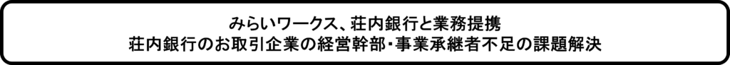 株式会社みらいワークス(本社:東京都港区、代表取締役社長:岡本祥治、以下「当社」)は、株式会社荘内銀行(本店:山形県鶴岡市、代表取締役頭取:田尾祐一、以下「荘内銀行」)と人材支援による地域企業の事業強化を目的とした業務提携契約を締結したことをお知らせいたします。また、今回の荘内銀行との提携をもって、38の地域金融機関と地方転職・副業人材の活用を推進することとなります。
