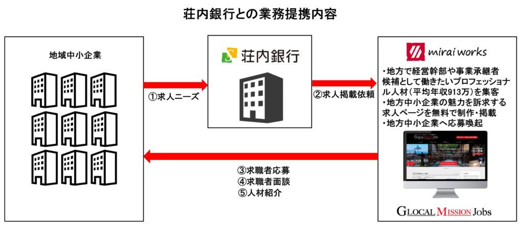今回、地方中小企業へ経営幹部や事業承継者として転職を希望する都市部人材約13,000名が登録する『Glocal Mission Jobs』と提携することにより、荘内銀行のお取引先の人材課題解決の強化を目指します。