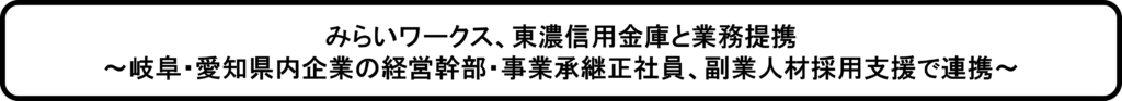 株式会社みらいワークス(本社:東京都港区、代表取締役社長 岡本祥治、以下「当社」)は、東濃信用金庫(本店:岐阜県多治見市、理事長 加知康之、以下「とうしん」)と人材支援による地域企業の事業強化を目的とした業務提携契約を締結したことをお知らせいたします。また、今回のとうしんとの提携をもって、56の地域金融機関と地方転職・副業人材の活用を推進することとなります。
