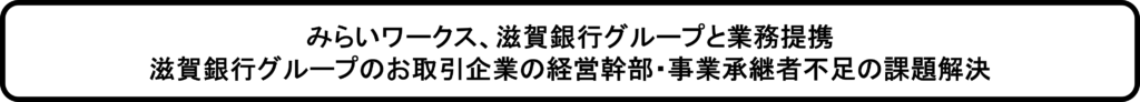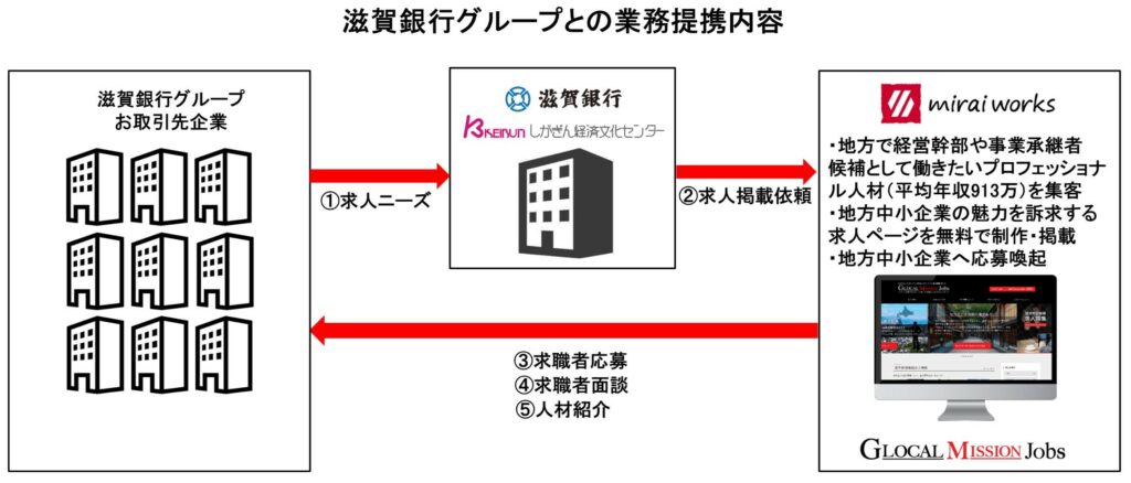 株式会社みらいワークス(本社:東京都港区、代表取締役社長岡本祥治、以下「当社」)は、株式会社滋賀銀行が100%出資する、株式会社しがぎん経済文化センター(所在地:滋賀県大津市、代表取締役社長 北川正義、以下「しがぎん経済文化センター」)と人材支援による地域企業の事業強化を目的とした業務提携契約を締結したことをお知らせいたします。また、今回のしがぎん経済文化センターとの提携をもって、57地域金融機関と地方転職・副業人材の活用を推進することとなります。