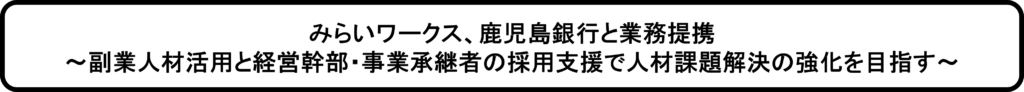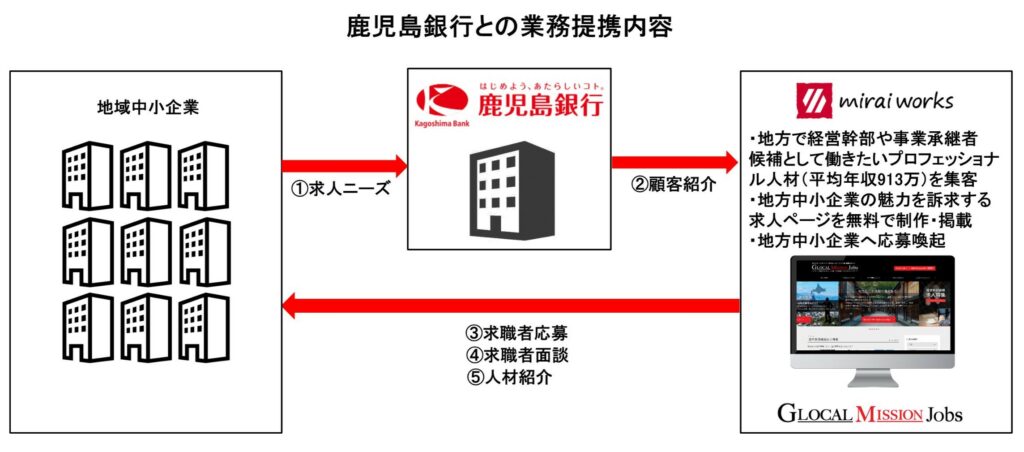 株式会社みらいワークス(本社:東京都港区、代表取締役社長 岡本祥治、以下「当社」)は、株式会社鹿児島銀行(本店:鹿児島県鹿児島市、取締役頭取 松山澄寛、以下「鹿児島銀行」)と人材支援による地域企業の事業強化を目的とした業務提携契約を締結したことをお知らせいたします。
