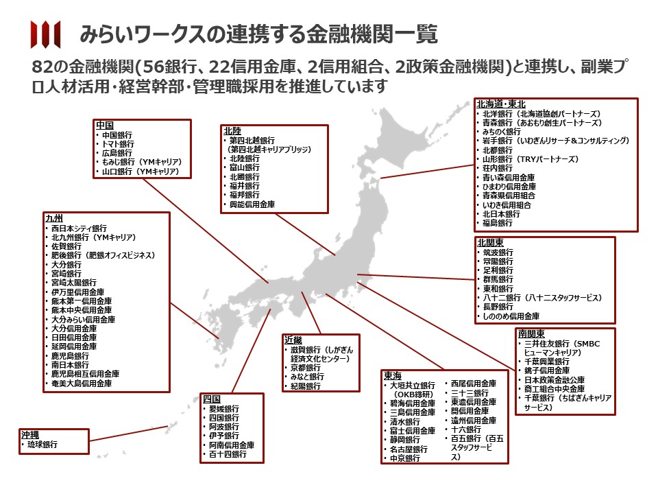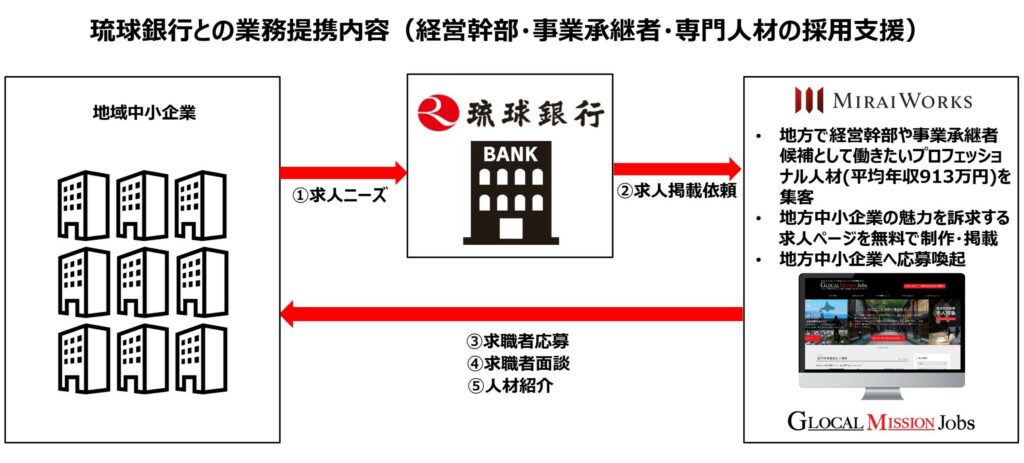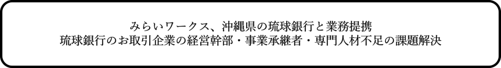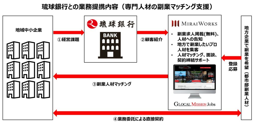 プロフェッショナル人材のフリーランス・副業といった多様な働き方をサポートする株式会社みらいワークス(本社:東京都港区、代表取締役社長:岡本祥治、証券コード:6563、以下「当社」)は、株式会社琉球銀行(本店:沖縄県那覇市、取締役頭取 川上康、以下「琉球銀行」)と人材支援による地域企業の事業強化を目的とした業務提携契約を締結したことをお知らせいたします。また、今回の琉球銀行との提携をもって、82の地域金融機関と地方転職・副業人材の活用を推進することとなります。